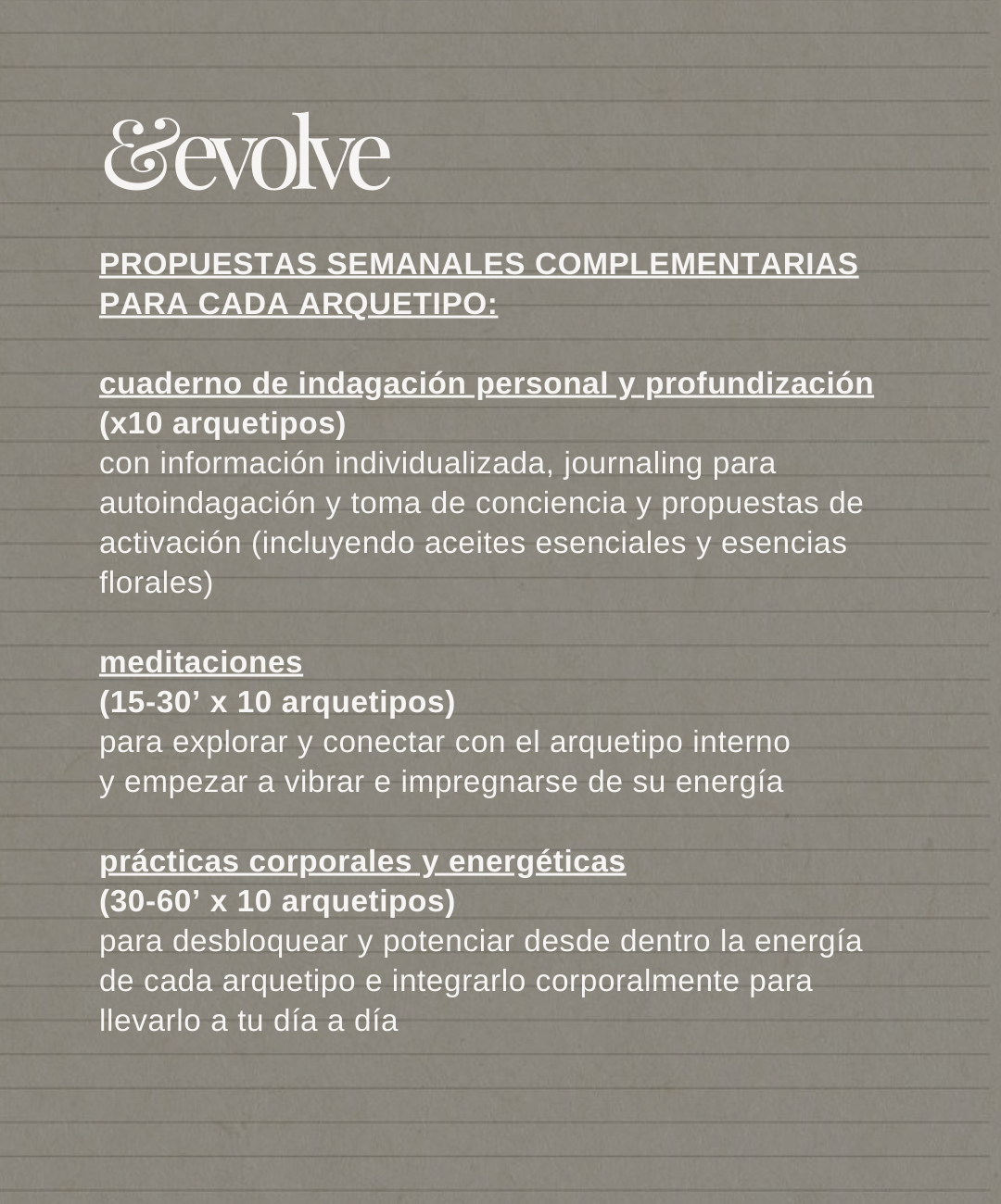 Y también tendrás el apoyo de meditaciones y prácticas corporales y energéticas para cada arquetipo que anclarán el trabajo en mente-cuerpo y lo harán tangible en tu día a día, y a las que podrás recurrir siempre que necesites para afianzar eso que desees potenciar de ti.